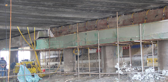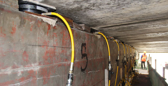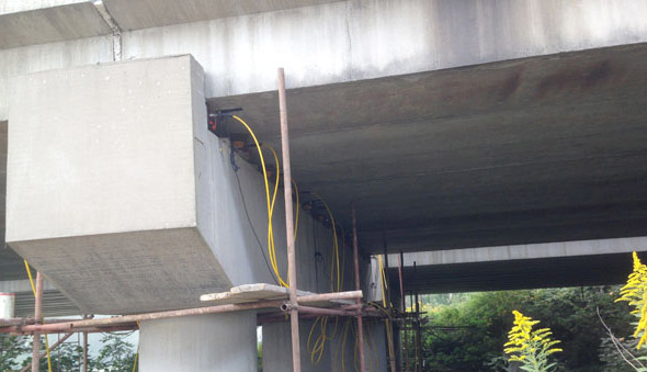 江廣高速公路改造工程JG-GG-2標許莊周梓中溝中橋,采用同步千斤頂104臺將原有橋梁抬高50mm及舊支座進行更換,此項目為泰州市重點城建項目、國家高速主干道京滬高速江都至廣陵段(簡稱江廣高速)改擴建工程, 此次工程將對該橋進行拼寬拓孔,即在原有位置往東側(cè)增加4孔,加長86米。